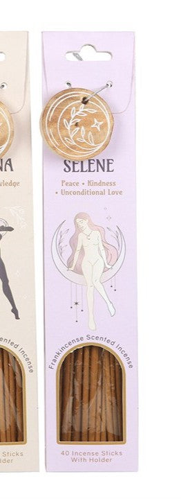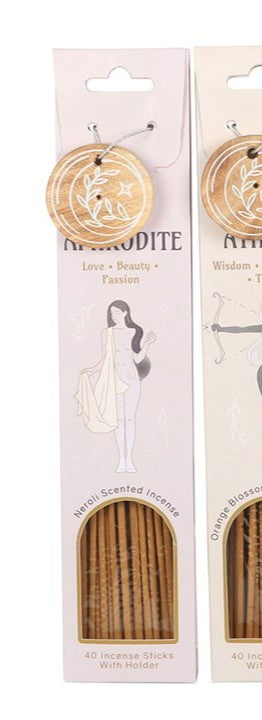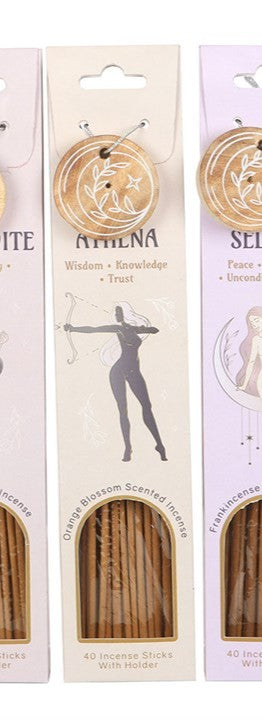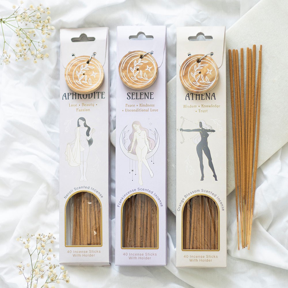 Cada embalagem é decorada com belas ilustrações inspiradas nas deusas Afrodite, Atena e Selene, com um suporte de madeira para incenso combinando, embalado perfeitamente para presentear. Apresentam as fragrâncias suaves de Neroli, o aroma terroso de Olíbano e o aroma doce de Flor de Laranjeira.